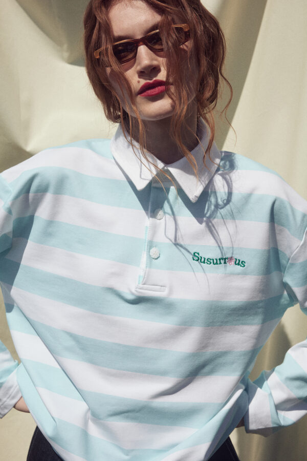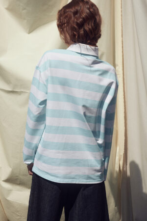 - Relaxed fit blue striped cotton polo shirt with long sleeves and collar.