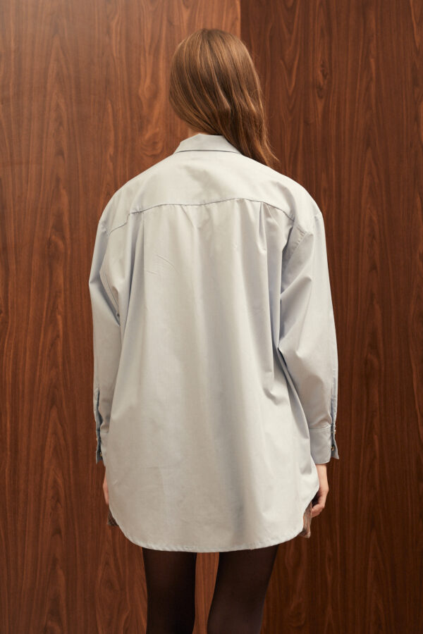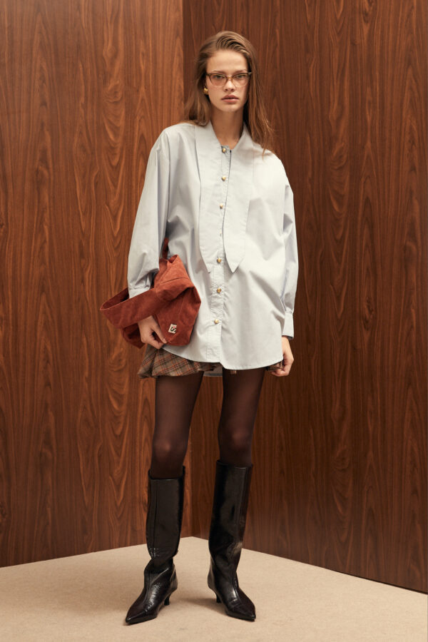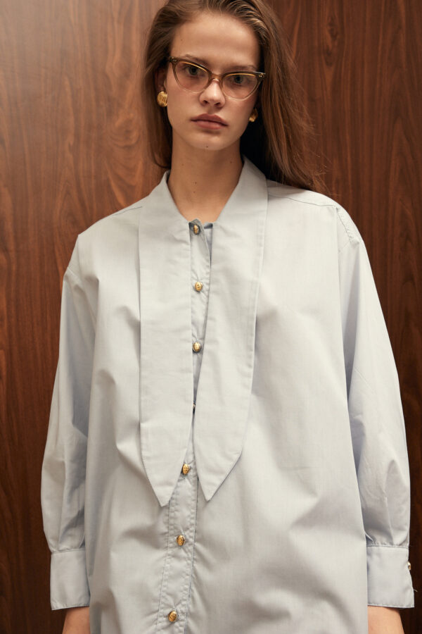 - Long-sleeved shirt with a self-tie neckline and cuffed sleeves finished with a statement button detail.