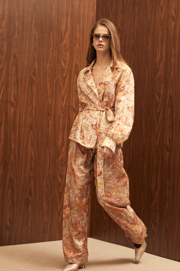 - Printed straight-leg pants with side pockets and an elasticated waistband.