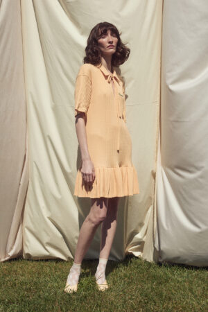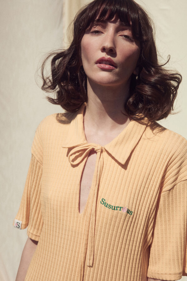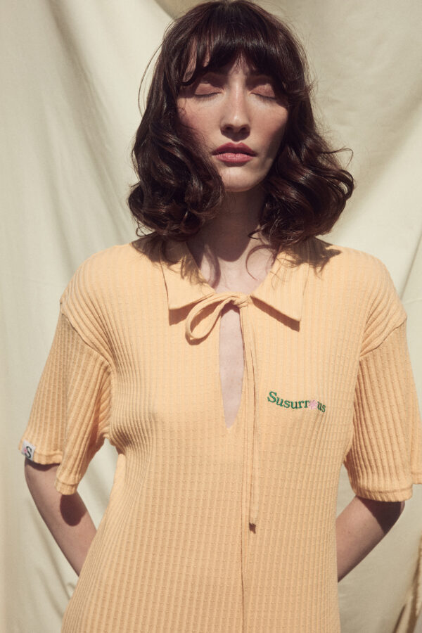 Short sleeves and lace-up collar.