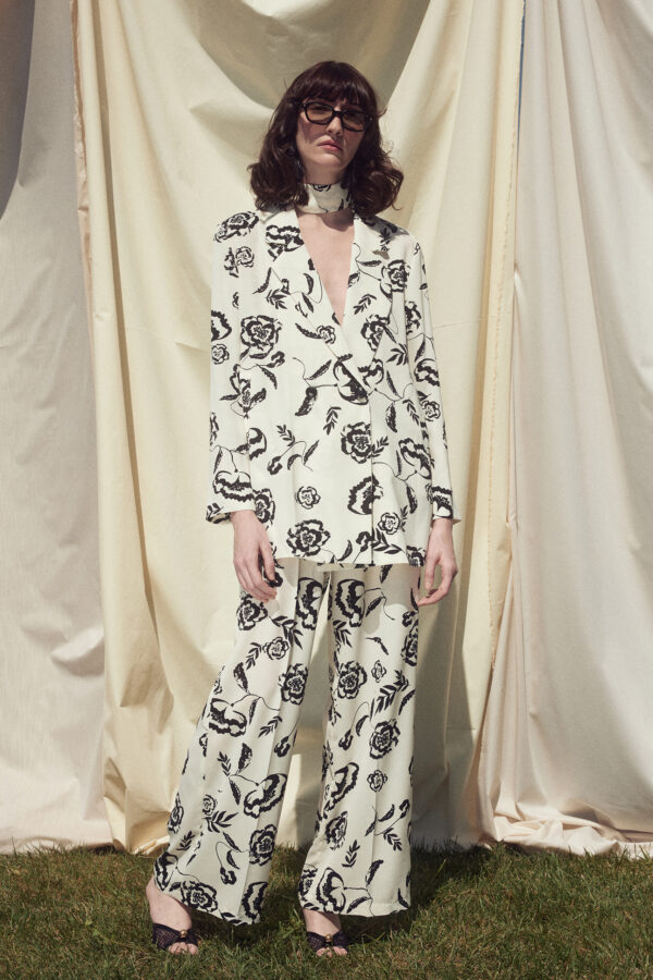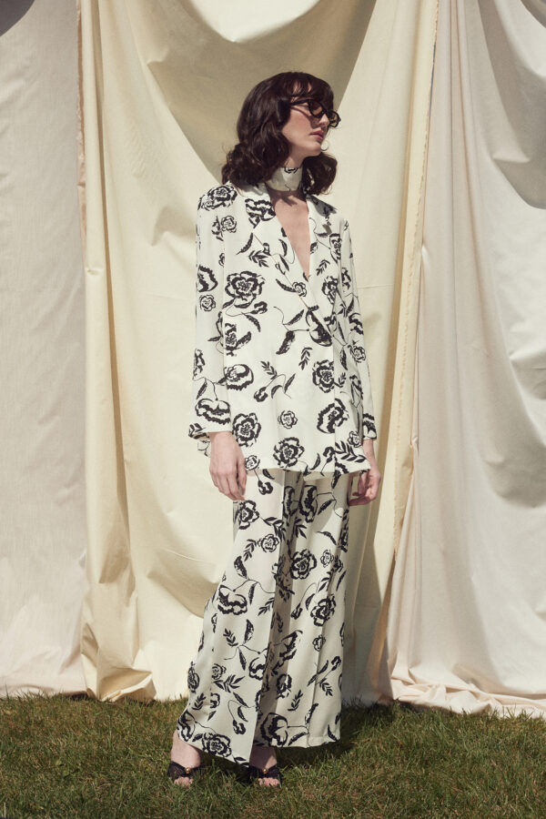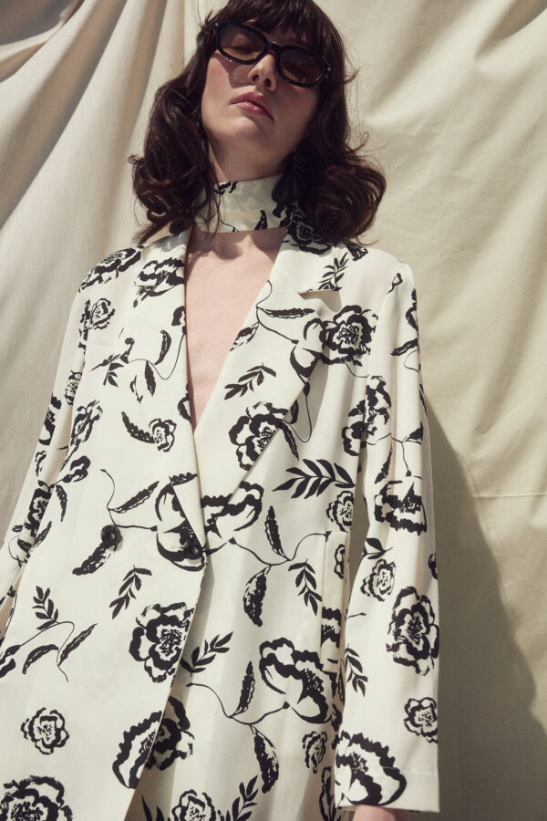 - Straight-cut blazer with long sleeves and a collar.