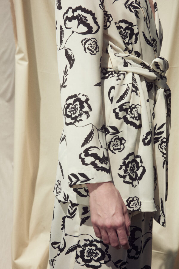 - Has a belt made of the same fabric.