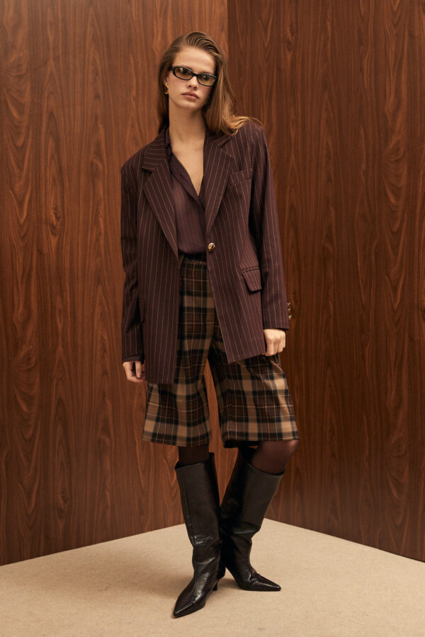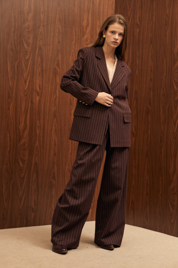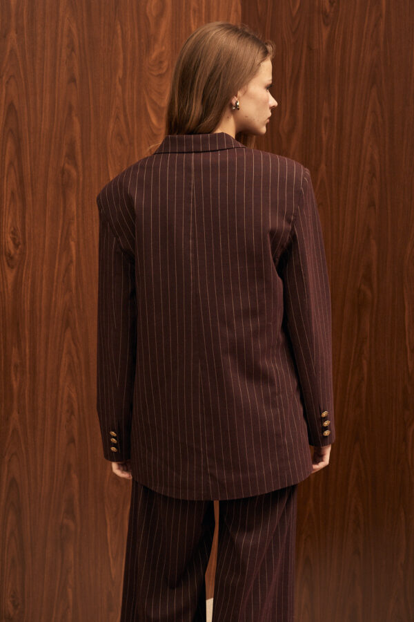- Straight-line jacket with collar and long sleeves that have buttons at the hem.