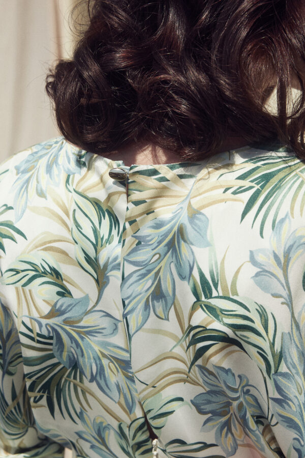 - Concealed back zip and button closure.