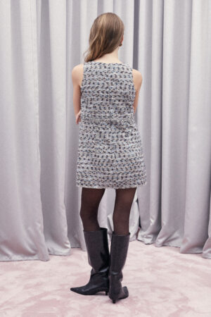 - Sleeveless dress with square neckline and decorative trim made from the same fabric.