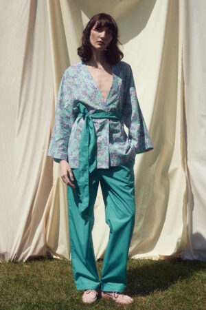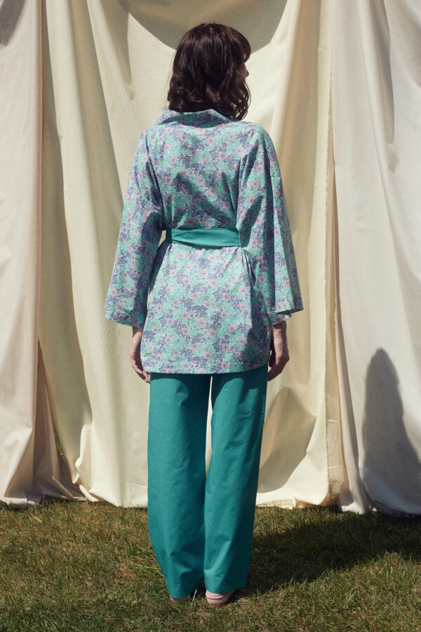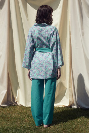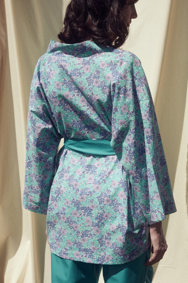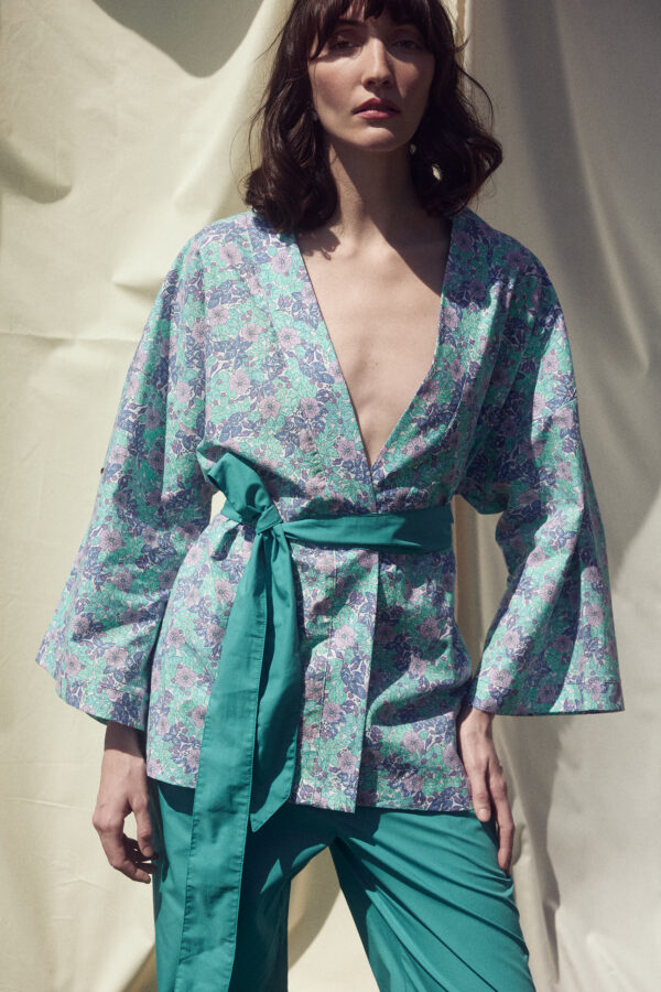 • Relaxed fit cotton floral kimono with 3/4 sleeves and straight cut. Features a self-tie belt.